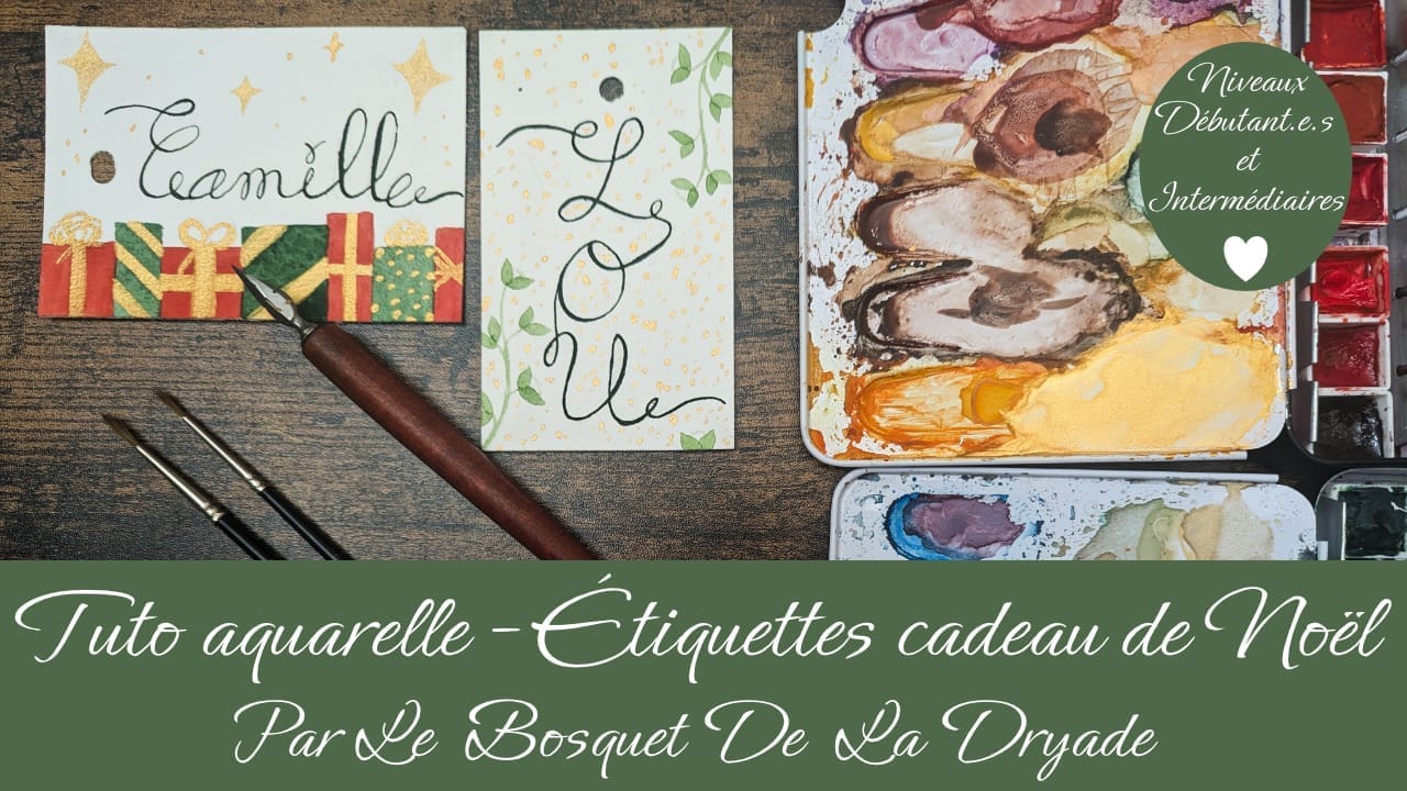 Voici une vidéo pour t'aider à peindre de jolies étiquettes cadeaux pour les fêtes à l'aquarelle.